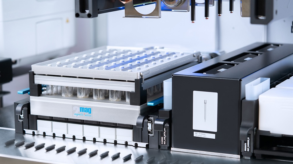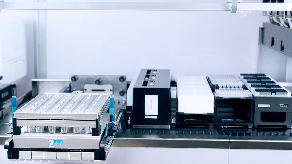 Pour l’intégration, nous vous mettons volontiers en contact avec notre partenaire de coopération expérimenté Hamilton Bonaduz AG. Une station d’accueil spécialement conçue pour le 2mag bioREACTOR 48 permet un raccordement simple et sans erreur de tous les conduits d’eau et électriques du bioREACTOR et une intégration simple et robuste sur la table du robot.